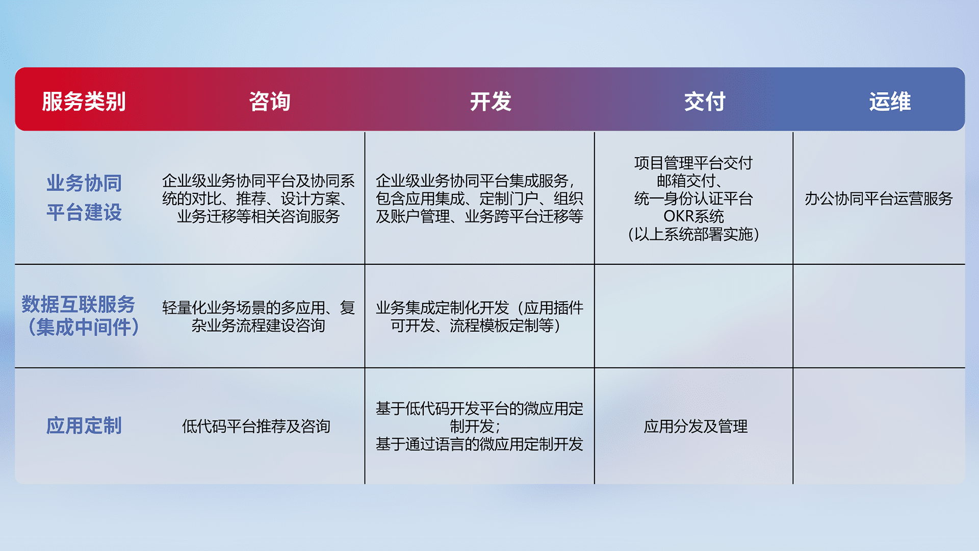针对钉钉、、、企微、、、IDaas等平台级产品提供产品的规划、、方案、、、、交付、、定制化开发等服务,,实现如统一协同办公、、、智能客户服务、、、、混合会议管理、、、智能数据查询、、、、等业务场景,,,,实现数字化转型。。